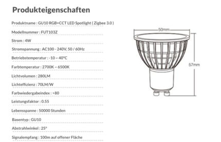 | Produktname: | 4W GU10 RGB+CCT LED-Strahler (Zigbee 3.0) |