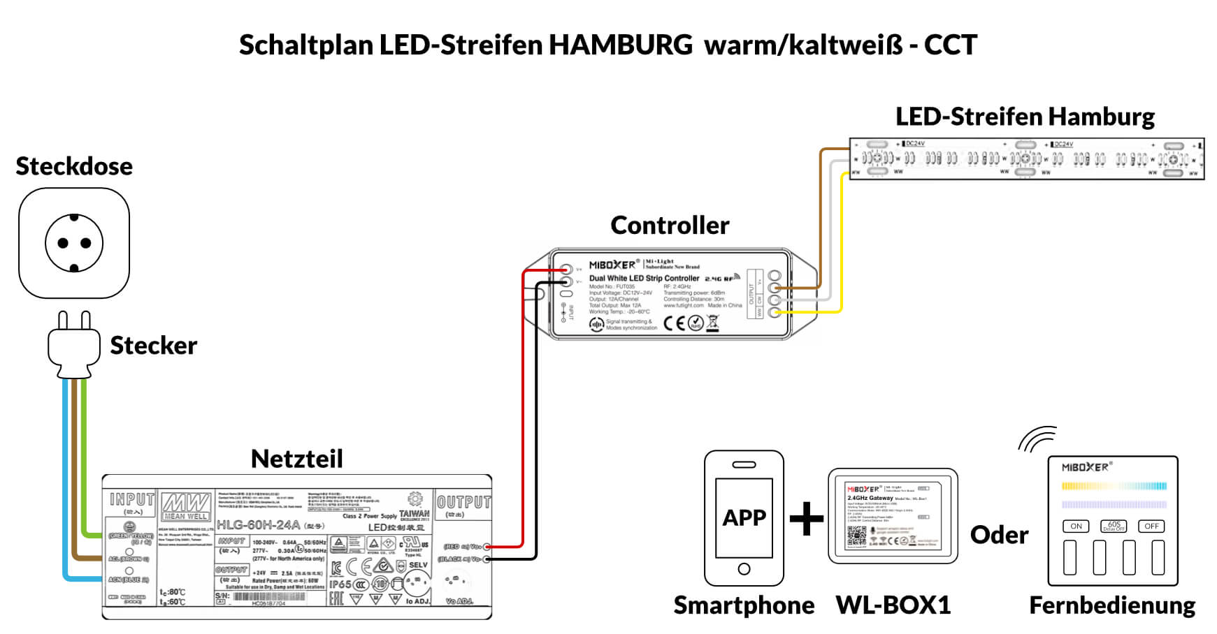 | Anschlussmöglichkeiten: | An beiden Enden des LED-Streifens |