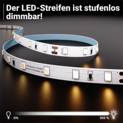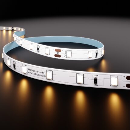 Mit 60 LEDs pro Meter (300 LEDs/5 Meter) bieten die Streifen eine dichte Bestückung und gleichmäßiges Lichtergebnis. Um Überhitzung zu vermeiden, empfehlen wir die Installation in LED-Aluprofilen von Hansemut.