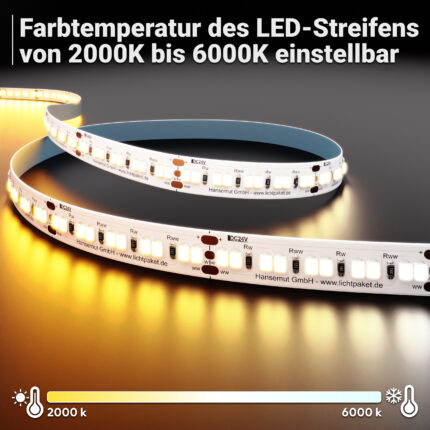 CCT-LED-Streifen. Dieser innovative Streifen vereint Warm- und Kaltweiß und