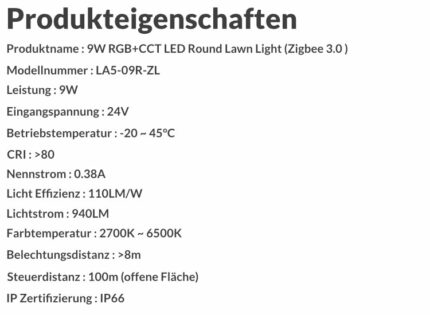 | Produktname | 9W RGB+CCT LED Runde Rasenleuchte (Zigbee 3.0) DC24V |