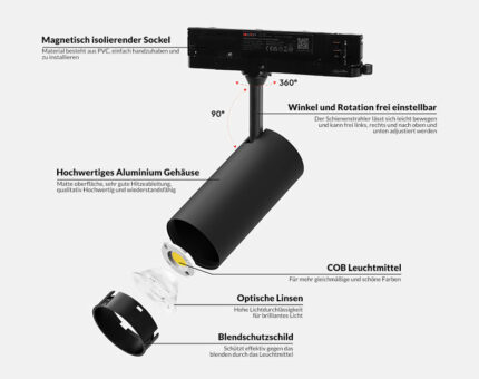 Diese Strahler funktionieren für das Schienensystem AMMR20S15B, AMMR20P15B, AMMR20F15B. Die CCT Strahler halten magnetisch in dem Schienensystem und können seitlich bewegt werden. Die Farbtemperatur der Lampen kann die Weißtöne zwischen 2700 – 6500 Kelvin wechseln. Somit ist es möglich, das Licht von warmweiß bis kaltweiß zu regulieren. Wer buntes Licht bevorzugt, kann seine Wunschfarbe auswählen. Es stehen bis zu 16 Millionen Farben zur Verfügung.