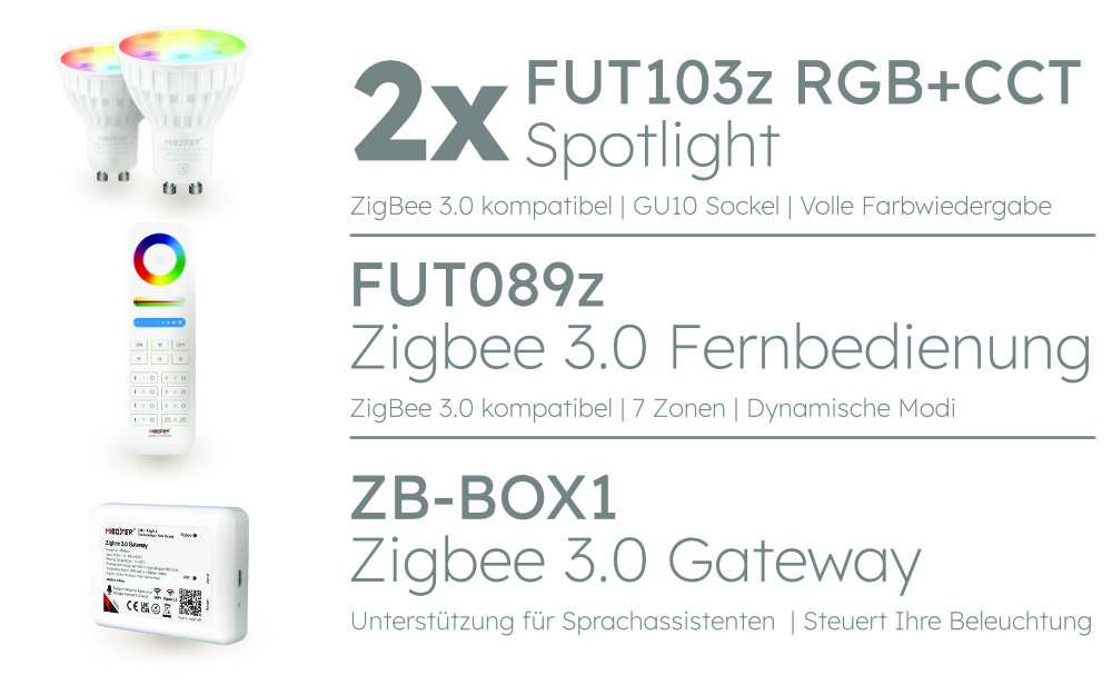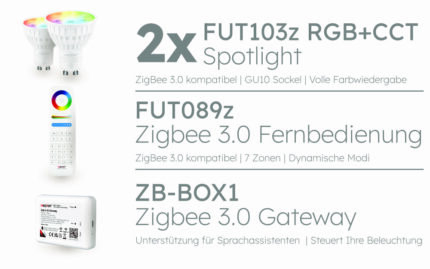 Mit unseren Set-Kit können Sie schnell und einfach Ihr Zuhause mit smarter Beleuchtung ausstatten. Die mit dem GU10 Sockel ausgestatteten Spotlights FUT103z unterstützen das volle Farb- und Farbtemperatur-Spektrum und lassen die Lichtgestaltung Ihrer Träume wahr werden.